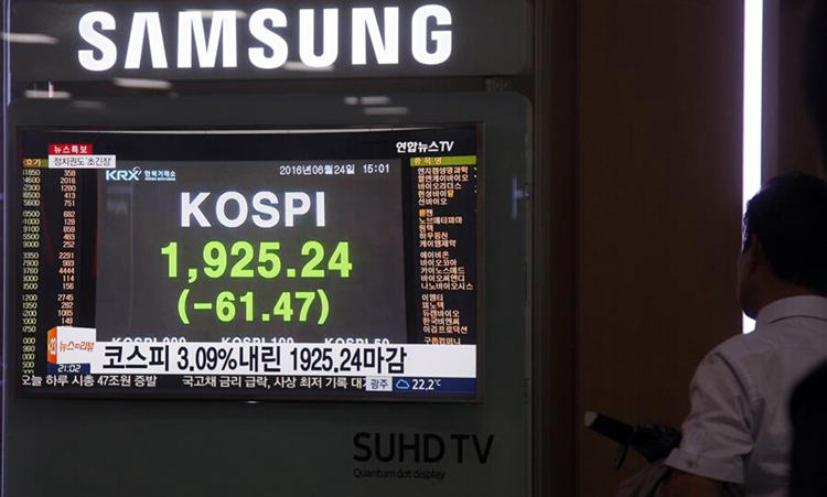 人民網6月24日訊 英國24日進行公投作出退歐決定,引發韓國金融市場的巨大動蕩。 據韓國KBS新聞網報道,24日當天,韓國綜合股價指數(KO[詳情]