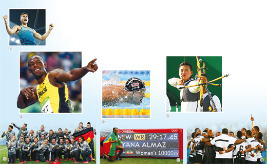 圖①:巴西撐桿跳高選手達席爾瓦。 圖②:牙買加短跑選手博爾特。 圖③:美國游泳選手菲爾普斯。 圖④:韓國射箭[詳情]