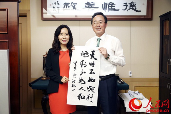 人民網首爾9月11日電(裴埈基)9月3日,人民網韓國分公司總經理周玉波到訪全羅北道。全羅北道知事宋河珍向周玉波贈送親手書寫的毛筆字“天時不如地利,地利不如人[詳情]