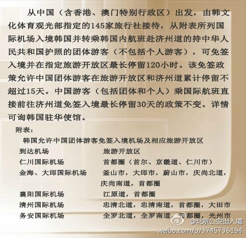 人民網北京10月23日電 據北京市公安局出入境管理總隊官方微博消息,2014年9月15日起,韓國擴大轉乘中國團體游客免簽入境制度適用范圍并延長相應停留期。[詳情]