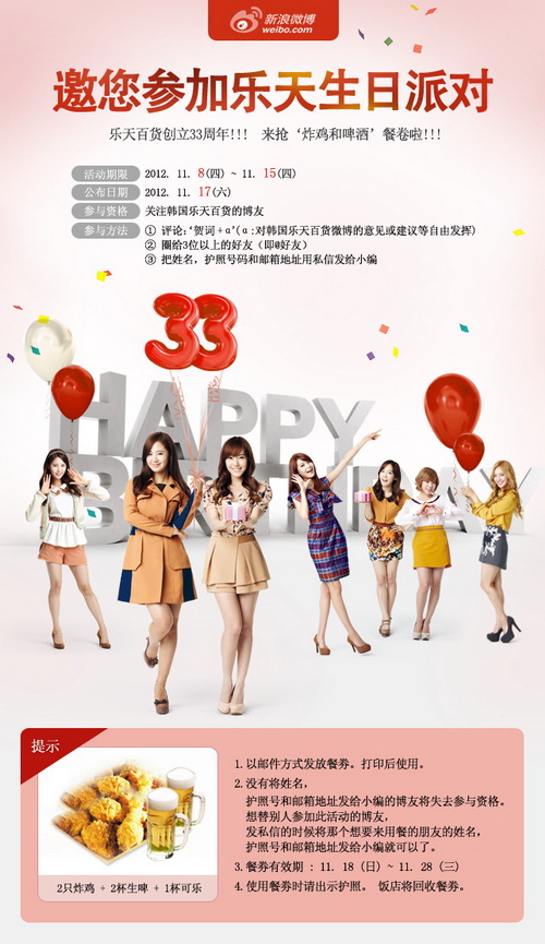 人民網11月8日電 樂天百貨為了慶祝成立33周年,在微博上舉行“邀您參加樂天生日派對”活動,與網友進行互動?;顒佑?1月8日開始舉行,持續到11月15日,[詳情]