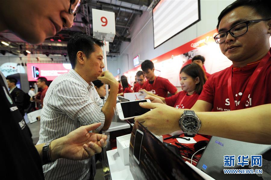 9月16日,在新加坡金沙展覽中心,顧客在檢查蘋果手機。 當日,蘋果手機iPhone7和iPhone7 Plus在新加坡開始發售。新華社發(鄧智煒攝) [詳情]