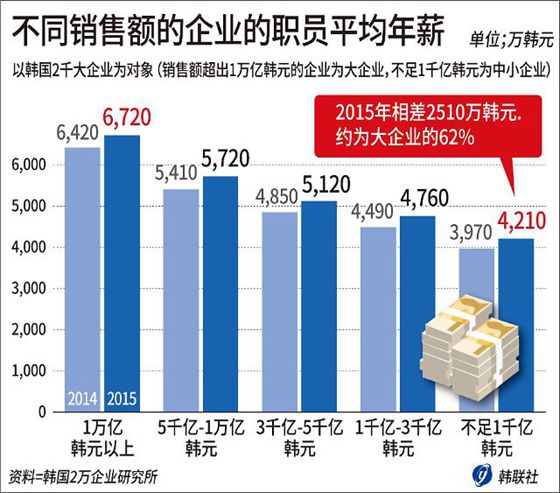 在韓國,銷售額超過1萬億韓元的大企業職員的平均年薪比銷售額不足1萬億韓元的中小企業高2500萬韓元(約合人民幣13萬元)左右,大企業與小企業職員的[詳情]
