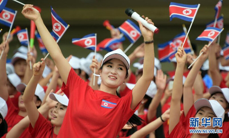 8月9日,朝鮮球迷拉拉隊為球隊加油。當日,在湖北武漢進行的2015年東亞杯足球賽中,韓國隊以0比0戰平朝鮮隊。 新華社記者程敏攝 “看朝鮮”相關新聞[詳情]