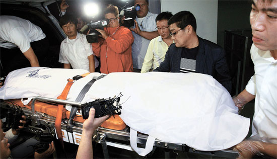 韓科學調查研究院移送俞炳彥尸體(網頁截圖)