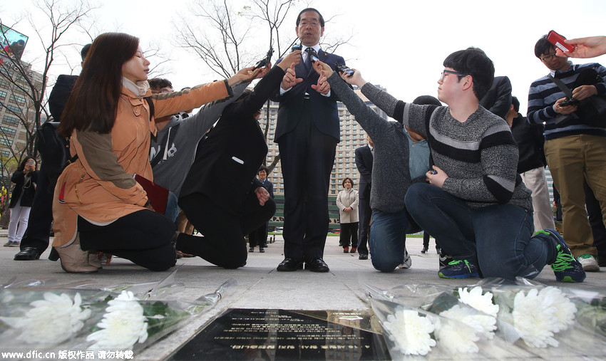 人民網4月15日訊 綜合報道,“世越號”沉船事故一周年前夕,韓國首爾市長樸元淳在首爾廣場上的紀念碑前默哀和獻花,紀念“世越號”沉船事故死難者。 “世[詳情]