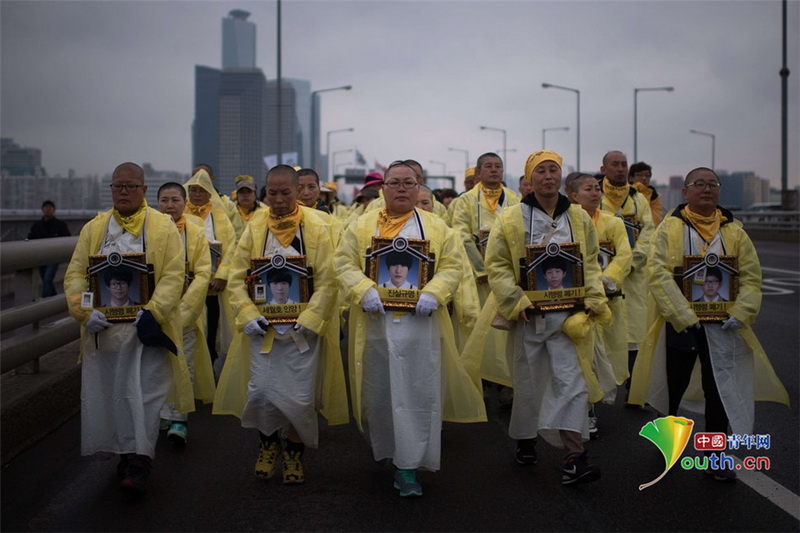 當地時間2015年4月5日,韓國首爾,韓國世越號客輪沉沒周年祭到來之際,遇難者家屬在漢江橋上組織游行。 “世越號”沉船事故相關新聞:http://k[詳情]