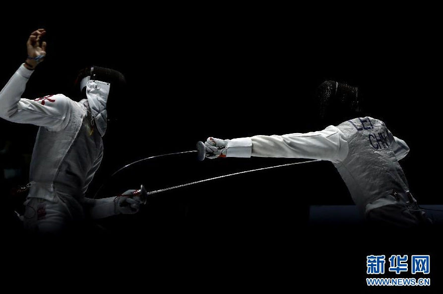 9月25日,中國隊選手馬劍飛(左)在比賽中。當日,在2014仁川亞運會男子花劍團體賽半決賽中,中國隊以45比30戰勝中國香港隊,晉級決賽。 新華社記者沈伯韓攝[詳情]