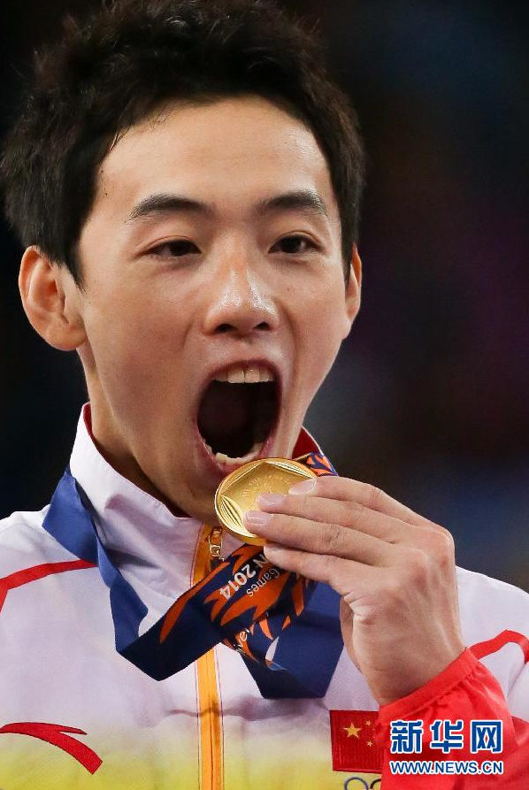 9月24日,中國選手鄒凱在頒獎儀式上咬金牌。 當日,在2014仁川亞運會體操男子自由操比賽中,中國選手鄒凱以15.533分獲得冠軍。新華社記者鄭煥松攝[詳情]