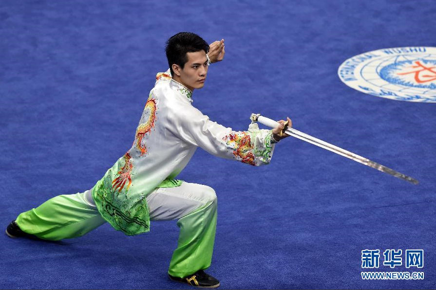 9月23日,中國選手陳洲理在太極劍比賽中。當日,在2014仁川亞運會武術男子太極拳/太極劍全能比賽中,中國選手陳洲理以19.53分的總成績獲得冠軍。 新華社記者[詳情]