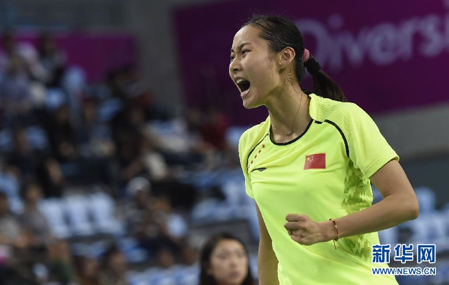 原標題:羽毛球女單:王儀涵奪冠 9月28日,王儀涵慶祝得分。當日,在2014仁川亞運會羽毛球女單決賽中,中國選手王儀涵以2比1戰勝隊友李雪芮,奪得冠[詳情]