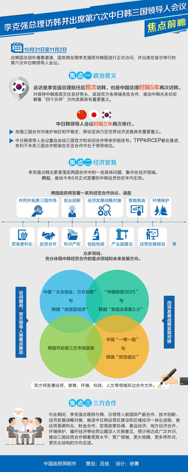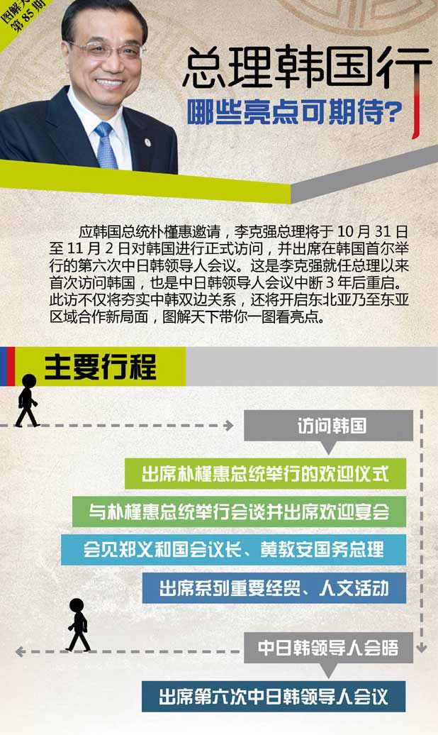 應韓國總統樸槿惠邀請,李克強總理將于10月31日至11月2日對韓國進行正式訪問,并出席在韓國首爾舉行的第六次中日韓領導人會議。這是李克強就任總理以來首次訪問[詳情]