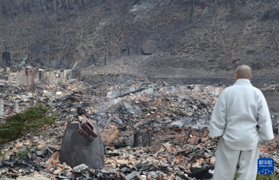 韓國山火已致28人死亡 3月27日,在韓國慶尚北道義城郡,僧人站在大火過后的古寺孤云寺廢墟前。新華社記者 姚琪琳 攝