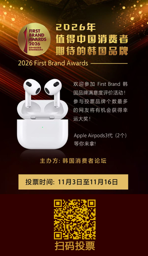 “2026年值得中國消費者期待的韓國品牌獎”有獎問卷調查啟動 11月3日至16日,韓國消費者論壇推出“2026年值得中國消費者期待的韓國品牌獎”問卷調查活動。
