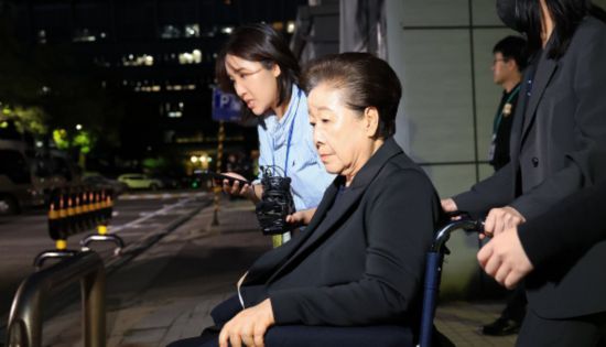 9月22日,在首爾中央地方法院,韓鶴子(坐輪椅)在逮捕必要性審查結束后離開法院大樓?!?/a>