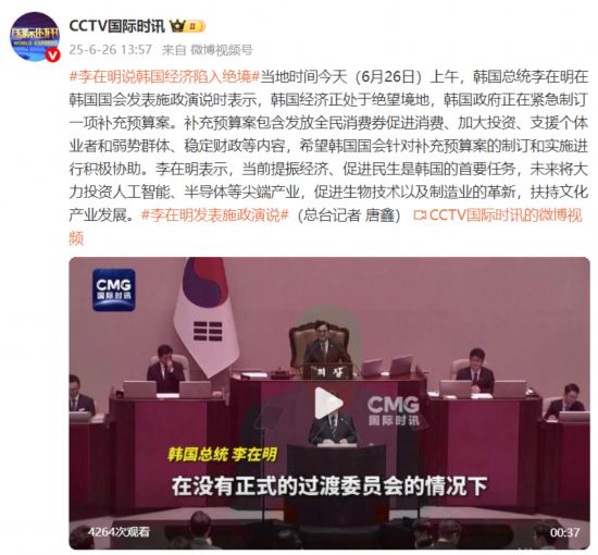李在明發表施政演說時表示“韓經濟正處于‘絕望’境地” 當地時間今天(6月26日)上午,韓國總統李在明在韓國國會發表施政演說時表示,韓國經濟正處于“絕望”境地,韓國政府正在緊急制訂一項補充預算案。補充預算案包含發放全民消費券促進消費、加大投資、支援個體業者和弱勢群體、穩定財政等內容,希望韓國國會針對補充預算案的制訂和實施進行積極協助?!?/a>
