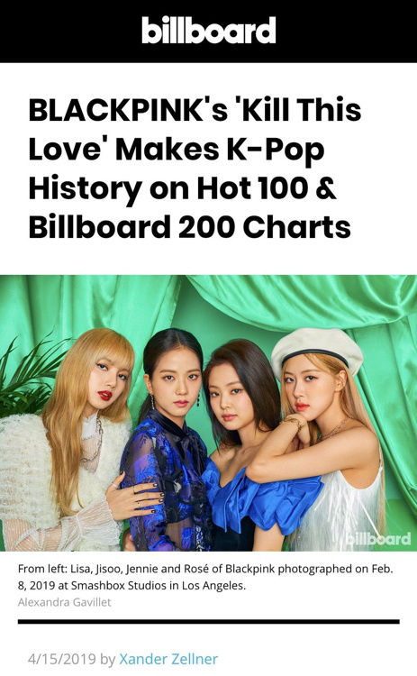BLACKPINK新輯躋身公告牌兩大主榜 創下K-POP女團最佳紀錄【組圖】 人民網訊 據韓聯社援引美國公告牌當地時間16日發布的最新榜單,韓國人氣女團BLACKPINK新輯《Kill This Love》在公告牌200強專輯榜和單曲百強榜名列第24位和41位,創下K-POP女團最佳紀錄。 據尼爾森音樂介紹,《Kill This Love》的音頻串流播放次數和下載次數分別達1860萬次和7000次,不僅在“串流歌曲排行榜”位居第22,還登頂“世界數碼音樂銷量排行榜”!
