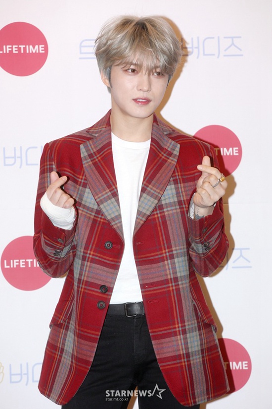 當日,金在中身穿紅色格紋休閑西服,搭配休閑黑褲,面帶微笑向大家打招呼,并熱情回答記者問題?!?/a>
