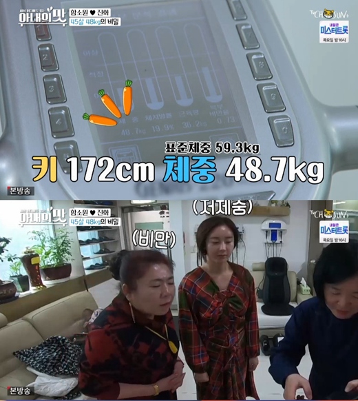 《妻子的味道》咸素媛體重公開 20年持續維持48公斤 人民網訊 近日,韓國綜藝節目《妻子的味道》曝光了咸素媛的體重。
