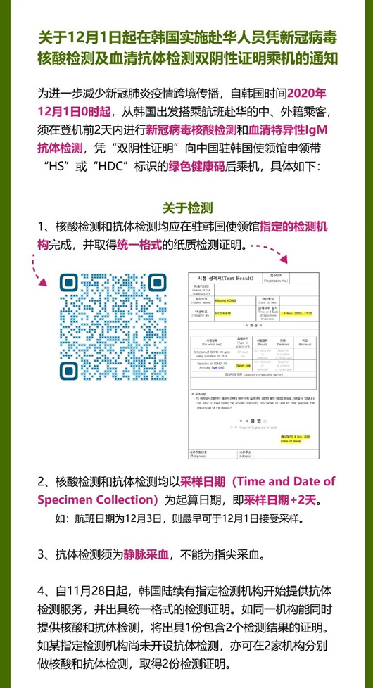 駐韓使館發布韓國赴華人員乘機新規定 12月1日起實施 人民網訊 11月26日,駐韓國大使館微信公眾號發布《關于12月1日起在韓國實施赴華人員憑新冠病毒核酸檢測及血清抗體檢測雙陰性證明乘機的通知》,具體內容如下:.…