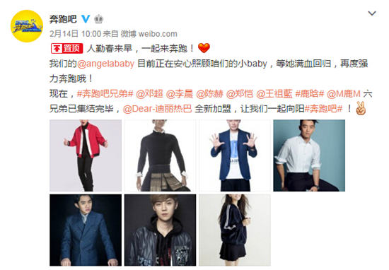 跑男更名公布陣容:迪麗熱巴加入 韓《Running Man》波折后繼續奔跑【組圖】 人民網2月15日訊 2月14日,綜藝節目《奔跑吧兄弟》通過官方微博宣布正式更名為《奔跑吧》,同時公開了第五季新成員迪麗熱巴。節目組發文稱:“目前正在安心照顧咱們的小baby,等她滿血回歸,再度強力奔跑哦!”第五季的出演陣容為鄧超、李晨、陳赫、鄭愷、王祖藍、鹿晗和迪麗熱巴!