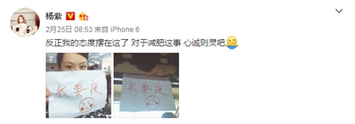 人民網2月27日訊 近日,楊紫接連曬出關于減肥的照片。25日上午,楊紫手拿寫有“我要瘦”的紙張并附文“反正我的態度擺在這了,對于減肥這事,心誠則靈吧!”