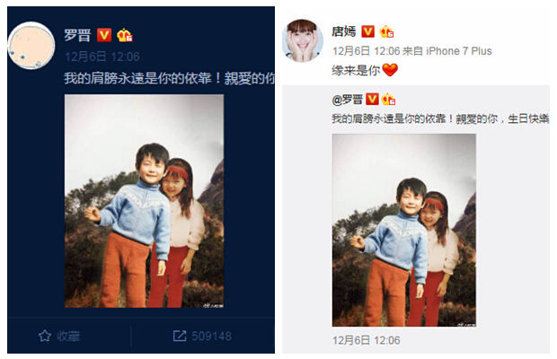 唐嫣羅晉公開戀情 細數今年脫單的韓星【組圖】 左為羅晉微博截圖,右為唐嫣微博截圖。