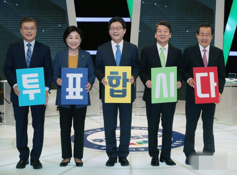 韓國舉行總統選舉第5輪電視辯論 五大黨候選人號召民眾投票【組圖】 人民網4月29日訊 第19屆韓國總統選舉第5輪電視辯論會28日晚在MBC電視臺舉行,共同民主黨候選人文在寅、自由韓國黨候選人洪準杓、國民之黨候選人安哲秀、正黨候選人劉承旼、正義黨候選人沈相奵共同參加。 此次辯論會由中央選舉委員會主辦,辯論會主題主要集中在經濟政策和如何解決就業問題!