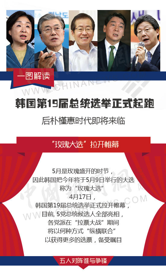 韓國總統選舉競選活動正式啟動 韓國第19屆總統選舉競選活動17日正式啟動,各總統候選人將展開為期22天的拉票大戰。 韓國媒體多以季節作喻,把此次大選稱作“玫瑰大選”!