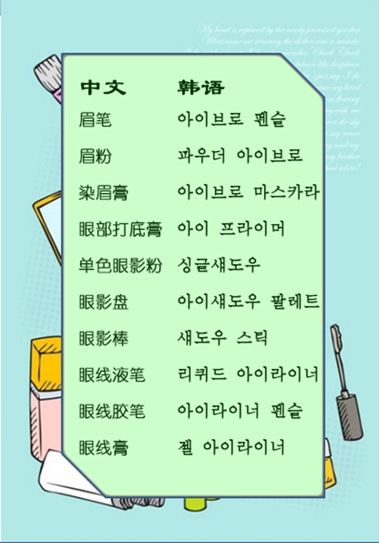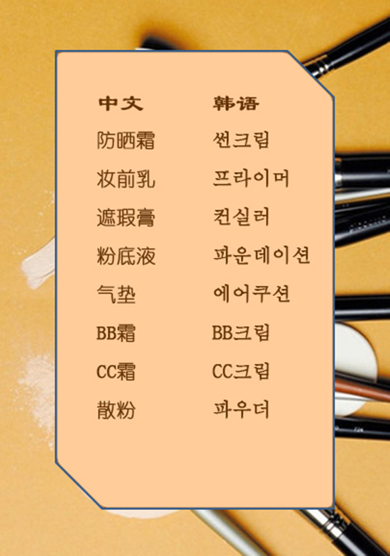【美妝達人的單詞本】美妝單詞中韓對照大全之底妝篇 人民網訊 要想擁有一個完美的皮膚狀態,除了在根源上做好護膚以外,使用一些合適的底妝產品可以錦上添花哦!市面上有很多類型的底妝產品,粉底液屬于傳統型產品,同時也是比較全能的底妝產品。氣墊近年人氣較高,勝在上妝更加方便!