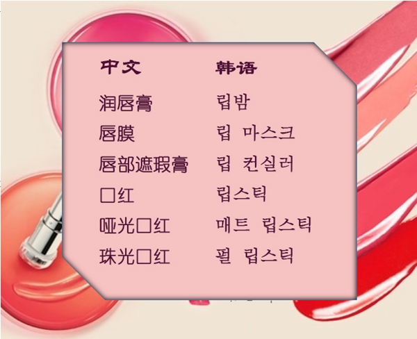 【美妝達人的單詞本】美妝單詞中韓對照之唇妝篇 人民網訊 古有唇紅齒白、朱唇玉面這樣的辭藻形容美女,今有受到萬千少女追捧的“想你色”“吃土色”“斬男色”等名稱形容唇色?梢,唇色于整體形象而言有很大影響,而口紅便是能改變唇色和提升氣色的化妝品!