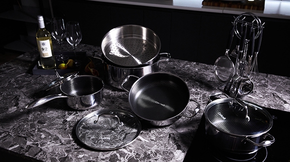 韓國BLACKCUBE公司旗下的廚具品牌Cookcell,憑借其高質量產品和超高性價比,備受消費者青睞。目前Cookcell產品已出口至美洲、歐洲、東南亞等地區的20多個國家。Cookcell的平底鍋產品采用獨家專利技術,鍋體為三層不銹鋼復合結構,鍋面采用六邊形圓點壓花技術,六邊形凹槽填充涂層。這種結構使食物與涂層表面的接觸面積最小化,從而降低食物燒焦的概率,同時改善涂層脫落現象,更易清洗,使產品具有較長的使用壽命。目前Cookcell產品已更新至第七代,其采用的陶瓷涂層耐用度和防粘鍋能力更強。【官網】