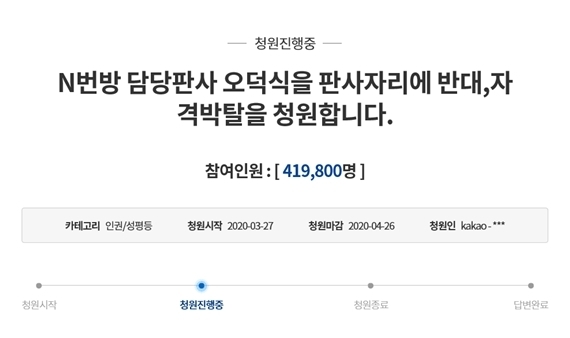 韓國近42萬人請愿更換“N號房”案主審法官 當事法官請辭獲批準 人民網訊 據韓媒綜合報道,首爾中央地方法院30日表示,因涉嫌違反兒童·青少年的性保護法被起訴的李某(16歲·網名為“太平洋”)案件的主審法官由之前飽受爭議的吳德植法官更換為樸賢淑法官。吳德植原定于30日對李某案進行公開審理!