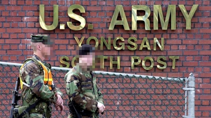 兩名駐韓美軍士兵在韓國龍山基地外 資料圖 圖源:韓國《韓國時報》報道配圖