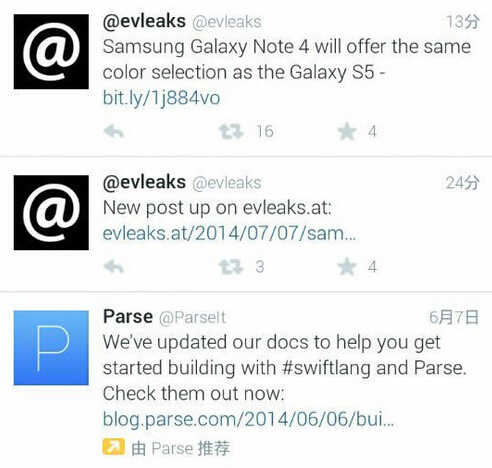 爆料大神在推特上表示Note 4手機并不會像大家期待的那樣,擁有金屬外殼,而是配備了特殊工藝處理的塑料外殼,但比一般的塑料外殼更有質感,另外四種顏色可以選擇,后期還會加入更多的版本與種類。