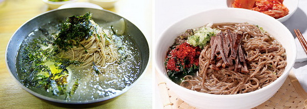韓國人喜歡的夏季飲食中,蕎麥面是必不可少的。蕎麥面一般分為冷食蕎麥面和熱食蕎麥面兩種。夏季常吃的是蕎麥涼面,有在泡菜冷湯中放入黃瓜、泡菜、蔬菜、肉后用調料醬拌著吃的蕎麥面和在醬油冷湯中放入蘿卜、蔥、辣根享用的蕎麥面。前者是韓式蕎麥面,后者是日式蕎麥面,它們的材料不同,吃法也不同。韓式蕎麥面以鳀魚為主材料制作肉湯,面和肉湯是盛在一個碗里的,而日式蕎麥面則用干鰹魚制作肉湯,面和肉湯分開盛放,吃的時候要把面放到湯里撈一下再吃。