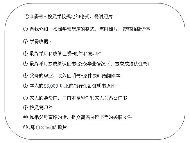 中國學生申請慶北大學至少要有高中畢業學歷。入學時需要提交的文件如下表所示。進入韓國時必須攜帶入境簽證,且登錄滿4個學期才會得到入境許可證。申請書可以郵件的方式發送到慶北大學的語言教育學院或親自提交至語言教育學院。