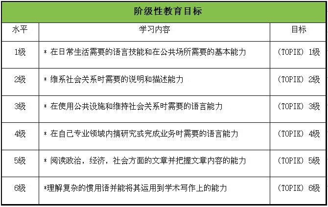 根據學生的韓語水平將學習內容分成6個階段,分別設定階段性的教育目標。一般情況下,1年(4個學期)共40周800課時,每周學習5天(周一到周五),每天學習4個小時。每班學員數為15名,每個學期給成績在前40%的優秀學生頒發獎學金。此外,每個學期還會安排一次體驗韓國文化和社會生活的活動。