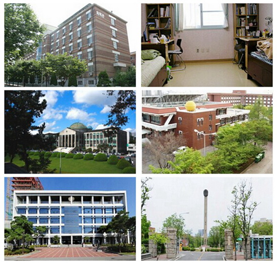 (從左到右從上到下依次為:宿舍外觀、宿舍內部、校園一角、學校食堂、圖書館、校門)