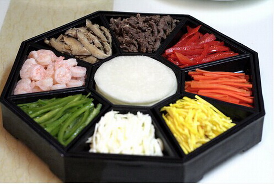 九折板就是在分為九個格子的木質容器中,分別盛放蔬菜和肉類的八種食物,用放在中央的小麥煎餅包裹周圍八種菜肴食用。由于在分為九格木質容器中,分別盛裝九種材料,由此得名九折板。九折板是將韓國母親的滿腔熱心和精細手藝充分展現出來的一道精美菜肴,可謂是色香味俱全的藝術作品。