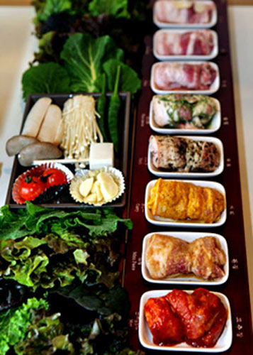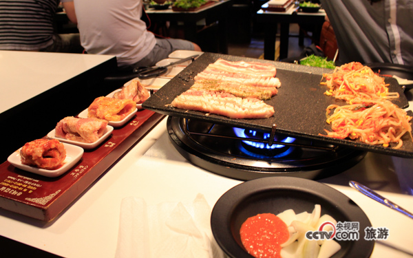 在韓國,說到烤肉大都是指五花肉。五花肉是韓國最主要的烤肉料理之一。用韓式調味醬料或用葡萄酒腌制,八色五花肉隨著時代的推移不斷推出新品,是一家難得的能品嘗到八種口味五花肉的店面。店址位于新村地鐵站附近,店名為“八色五花肉”。