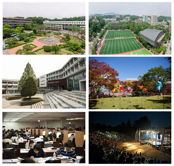 (從左到右,自上而下依次是:校園鳥瞰、學校操場、宿舍外部、校園一角、學校圖書館、晚間活動)