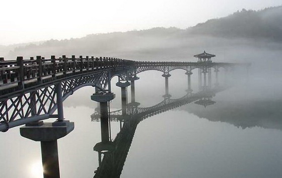 看完了陶山書院,讓我們再次回到安東市。月映橋是韓國慶尚北道最長的木柵橋,因月映臺在1974年修筑安東水壩時遭淹沒,后來修筑此橋時市民們提議取名為月映橋。月映橋于2003年建成,長387米、寬3.6米,橋上設立了羽翼型噴水臺,在橋上的八角亭上可以俯瞰安東湖的秀麗景色。每到夜晚,來到這里乘涼的市民絡繹不絕,他們三三兩兩坐在周圍,看著湖光山色,享受著此刻的清閑與自在。離月映橋不遠處有一個名叫“Hands Coffee”的咖啡廳,這里吸引了不少游客前來休憩。