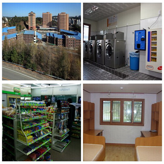 從左上順時針依次為:宿舍全景、洗衣房、宿舍內部、便利店