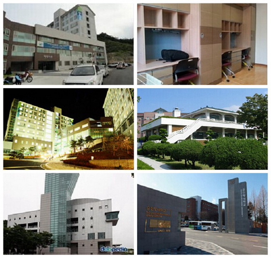 (從上到下從左到右依次為:宿舍外觀、宿舍內部、學校夜景、學校食堂、學校圖書館、學校大門)