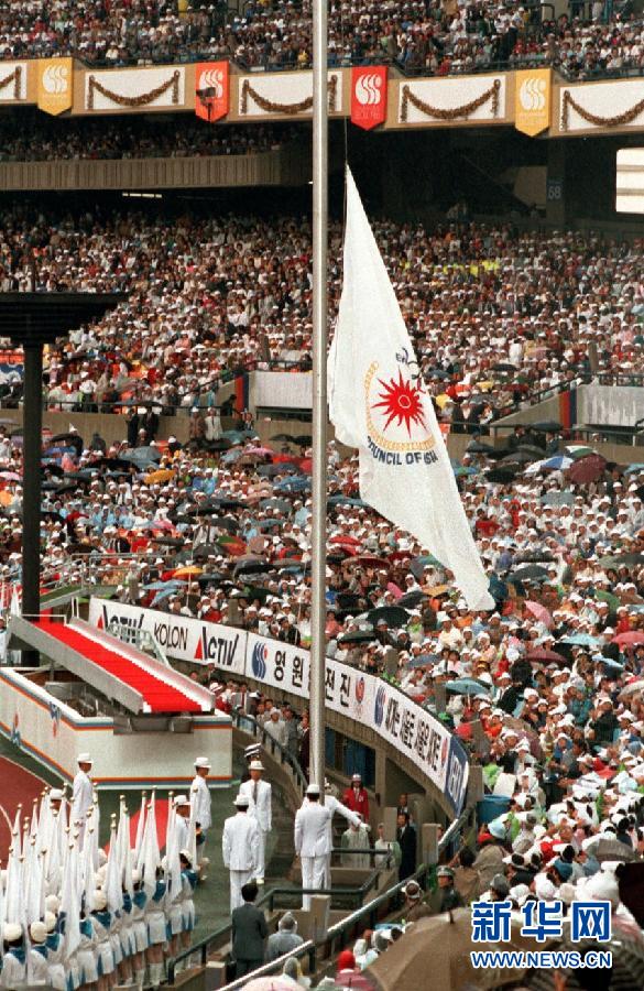 第十屆亞運會于1986年9月20日至10月5日在韓國首都漢城(今稱首爾)舉行,27個國家和地區的3345名運動員參賽。本屆亞運會產生270枚金牌,中國代表團在最后時刻以一枚金牌的優勢險勝東道主韓國,最終以94枚金牌繼續列獎牌榜首位,韓國列第二,日本以58枚金牌排在第三位。本屆亞運會破三項世界紀錄,平兩項世界紀錄。圖為在第十屆亞運會開幕式上,亞運會會旗在漢城主體育場升起。新華社發