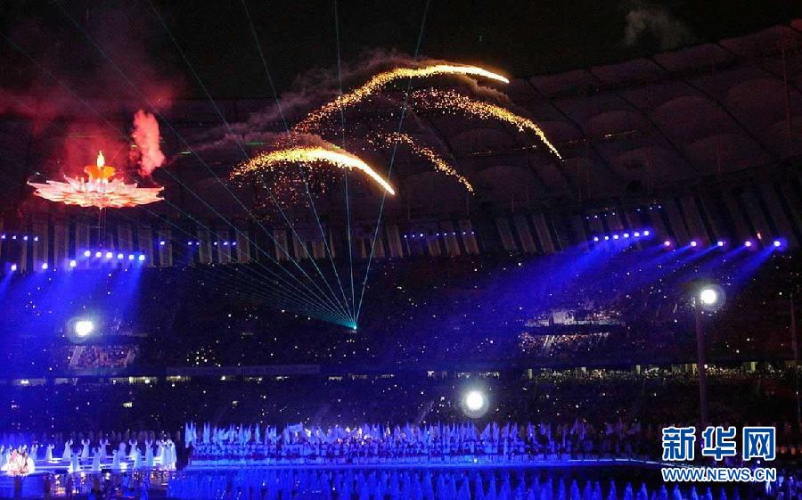 第十四屆亞運會于2002年9月29日至10月14日在韓國釜山市舉行,44個國家和地區的上萬名運動員參賽。中國、韓國和日本列獎牌榜前三位。本屆亞運會共產生427枚金牌,刷新世界紀錄22項、創造亞洲新紀錄43項。圖為在第十四屆亞運會開幕式上,亞奧理事會成員的火種匯集在一起。圖為釜山亞運會開幕式。新華社發