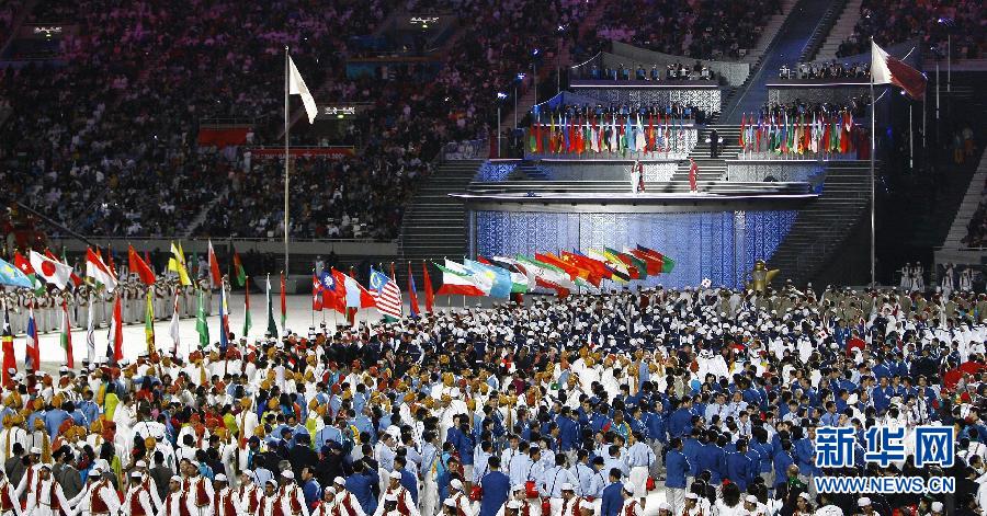 第十五屆亞運會2006年12月1日至15日在卡塔爾首都多哈舉行,來自45個國家和地區的逾萬名選手參賽。本屆亞運會共設39個大項424個小項,中國代表團共奪得165枚金牌,連續第七次在亞運會上雄踞金牌榜第一位。韓國以58枚金牌列金牌榜第二;日本以50枚金牌列第三。本屆大賽中,共有3人7次打破三項世界紀錄,平兩項世界紀錄,刷新23項亞洲紀錄。圖為在第十五屆亞運會開幕式上,參賽國家和地區的選手歡聚一堂。圖為多哈亞運會開幕式。新華社發