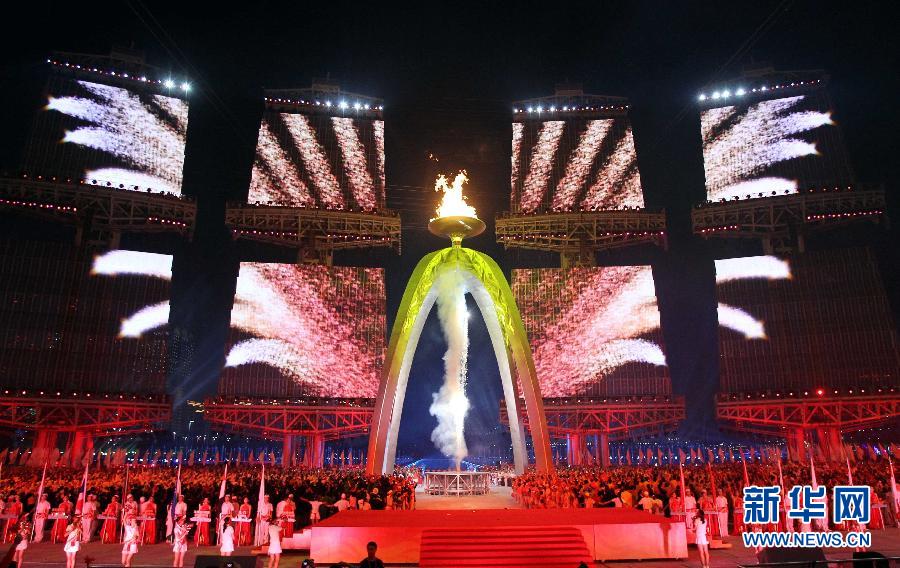第十六屆亞洲運動會于2010年11月12日至27日在廣州舉行。來自亞洲45個國家和地區的近萬名運動員刷新3項世界紀錄、15項亞洲紀錄和27項亞運會紀錄。29個國家和地區獲得亞運會金牌,36個國家和地區獲得亞運會獎牌。中國體育代表團取得199枚金牌、416枚獎牌,連續八屆名列亞運會金牌榜首位。圖為2010年11月12日,在第16屆亞洲運動會開幕式上,亞運會圣火熊熊燃燒。新華社發