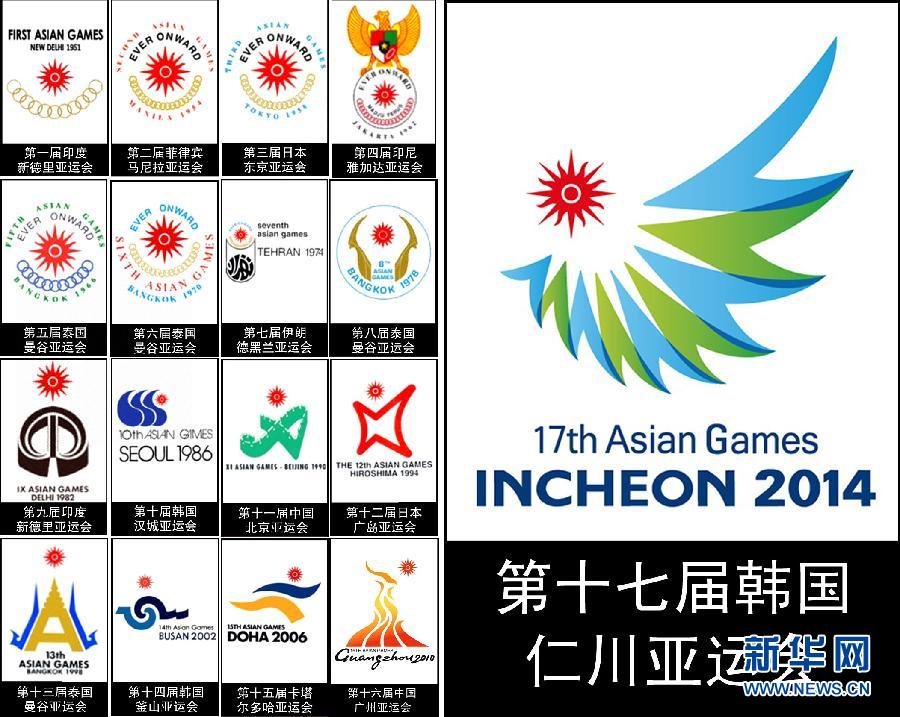 圖為歷屆亞運會會徽(拼版照片)。第十七屆亞運會于2014年9月19日至10月4日在韓國仁川舉行。 新華社發